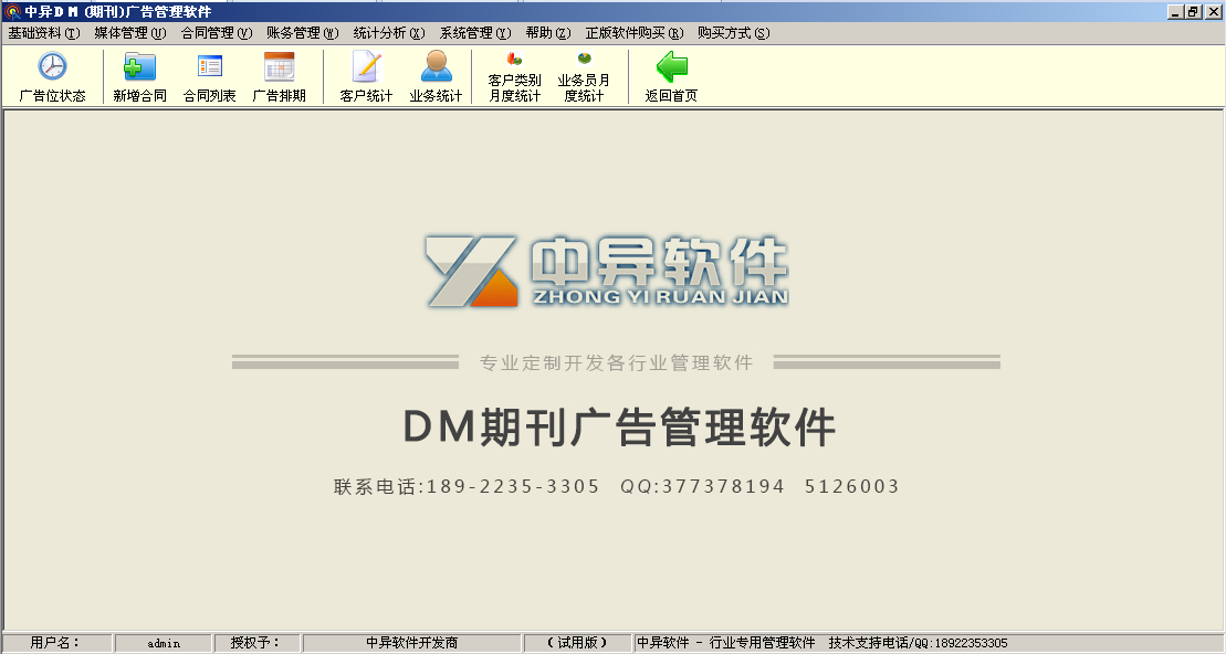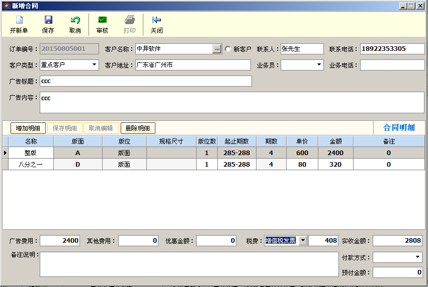 3、合同管理:客戶業(yè)務訂單合同往來的管理,刊登廣告位、期數(shù)、等已收未收款的 管理