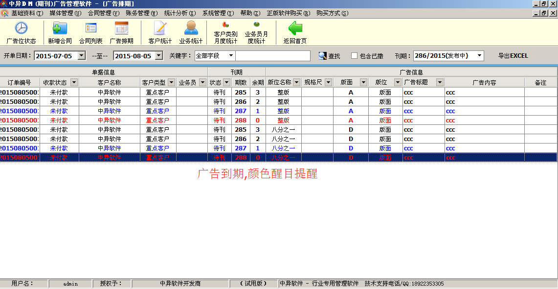 3、廣告排期:查詢客戶每期廣告位刊登,方便排版,已撤等信息,顏色提醒廣告位到期